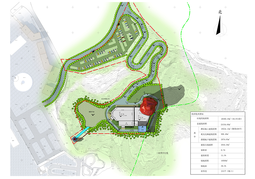 项目选址环境清雅舒适,设施齐全。放眼望去,酒店恍若一颗硕大的朱砂红宝石横空出世,镶嵌在山峦之巅,高耸入云,直取天际,十分惊艳。在悬崖栈道尽头有升降电梯直达酒店,为来此旅游的游客提供了更具文化品位与更贴心的度假空间。